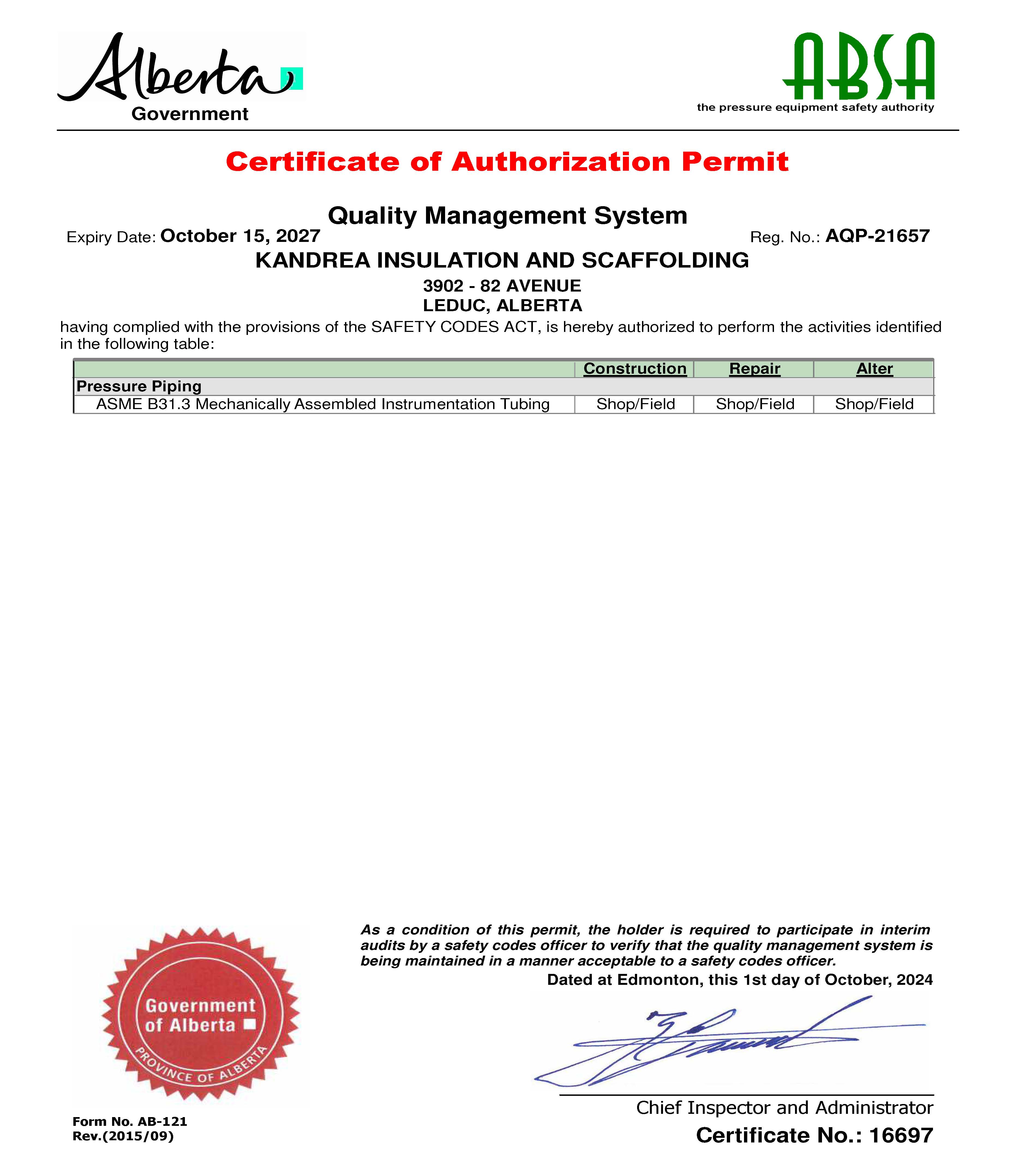 Kandrea provides ITP’s (inspection test plans) for all tracing. As an additional service and safety to our clients, we have obtained ABSA Certification for pressure testing tubing.